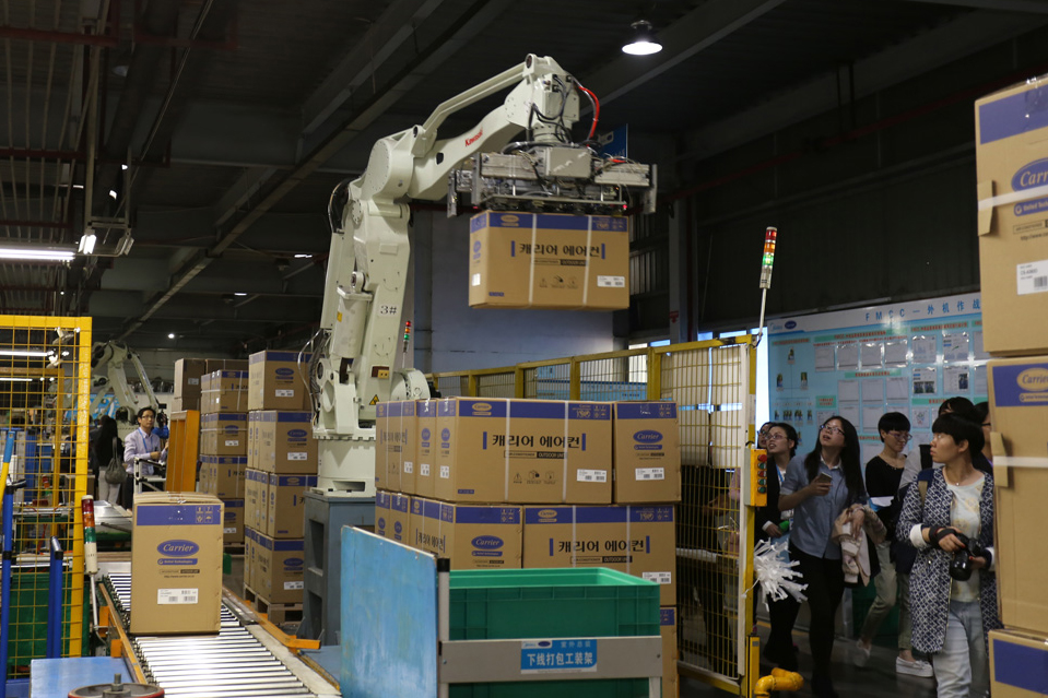 現(xiàn)在的空調生產線,出現(xiàn)的已不再是擁擠忙碌得跟陀螺似的產業(yè)工人。因為不少的“機器手”、“機器人”的出現(xiàn),勞動密集型的家電制造工廠被賦予了全新的“科技感”和“智能化”的色彩。在空調室內、外機總裝線體的末端,裝箱、打包等繁重環(huán)節(jié),早已被機器人所取代。當成品從生產線上完成之后,也是通過機器手直接搬運到流轉板上。